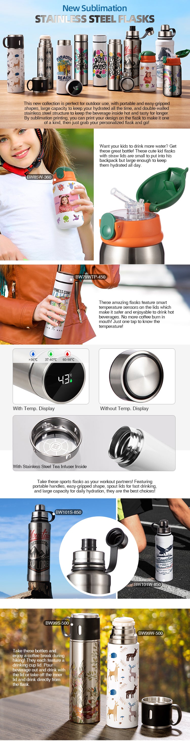 This new collection is perfect for outdoor use, with portable and easy-gripped shapes, large capacity to keep your hydrated all the time, and double-walled stainless steel structure to keep the beverage inside hot and tasty for longer. By sublimation printing, you can print your design on the flask to make it one of a kind, then just grab your personalized flask and go!