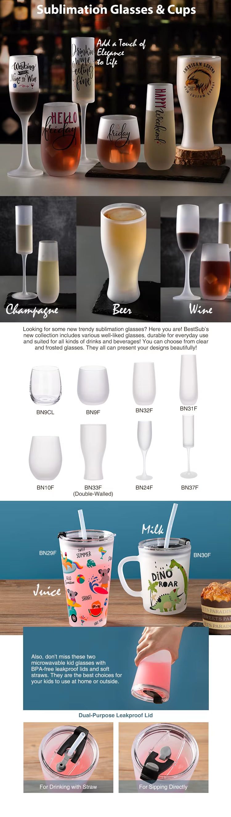 Looking for some new trendy sublimation glasses? Here you are! BestSub’s new collection includes various well-liked glasses, durable for everyday use and suited for all kinds of drinks and beverages! You can choose from clear and frosted glasses. They all can present your designs beautifully!