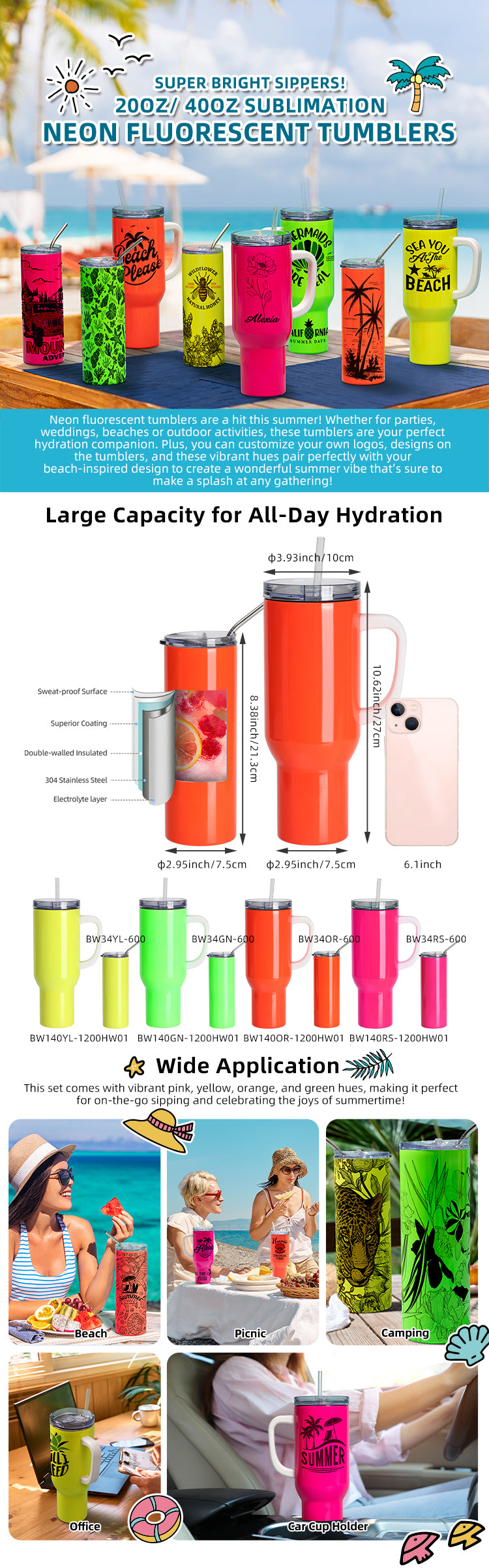 Item Name: Sublimation Blanks 40oz/1200ml Stainless Steel Fluorescent Green Travel Tumbler with Lid & Straw(White Handle)
